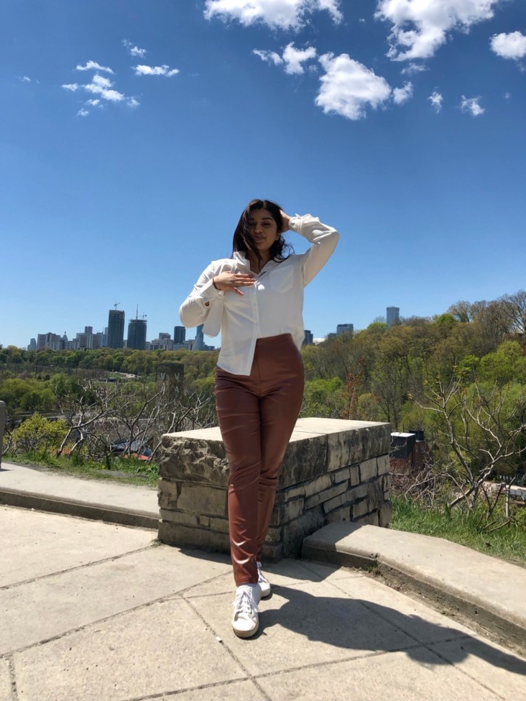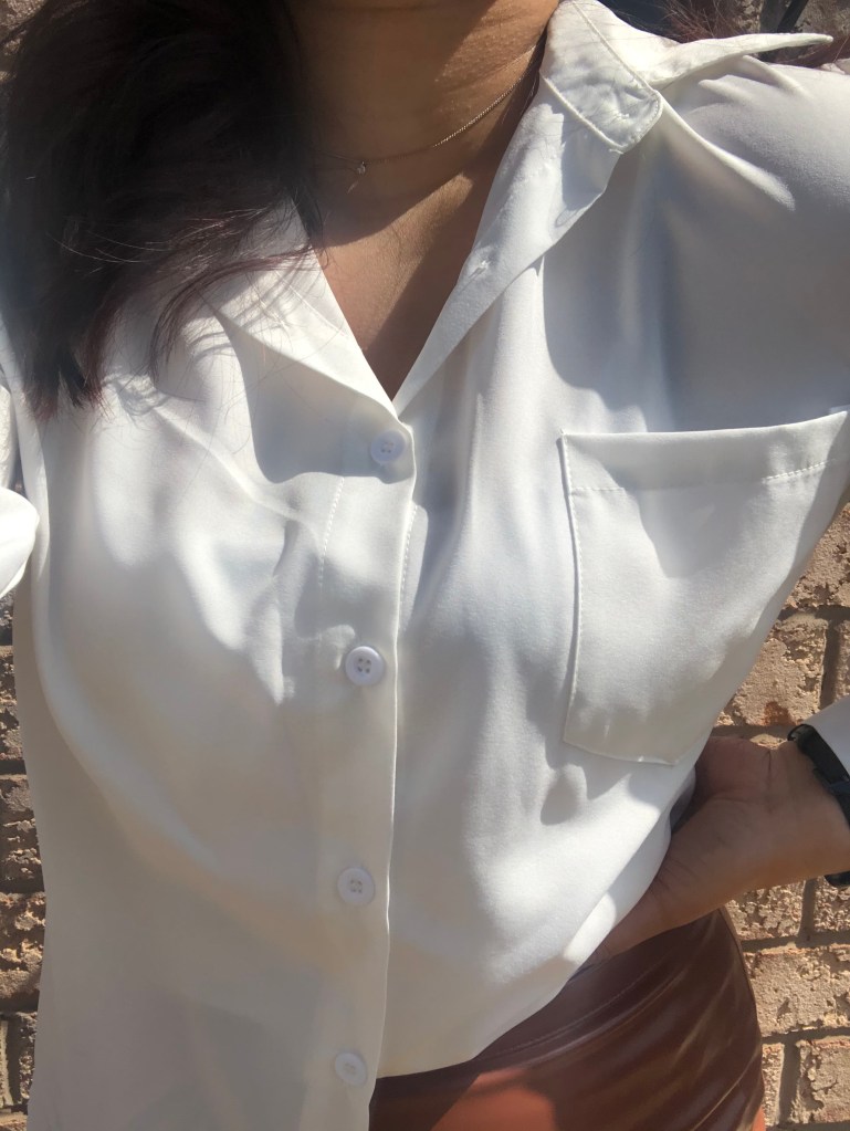 One staple item that I find myself gravitating towards, to create so many outfits is a classic white button-up shirt! I use a white button-up to layer under dresses to give it an extra edge, or pair it with a blazer or skirt to achieve a work-friendly outfit! However, my absolute favourite way to style a white button-up is tucked with some faux leather pants or shorts! I am a lover of faux leather or coated pants and there are few items that truly let the pants be the star of the outfit, it looks so effortless yet edgy!