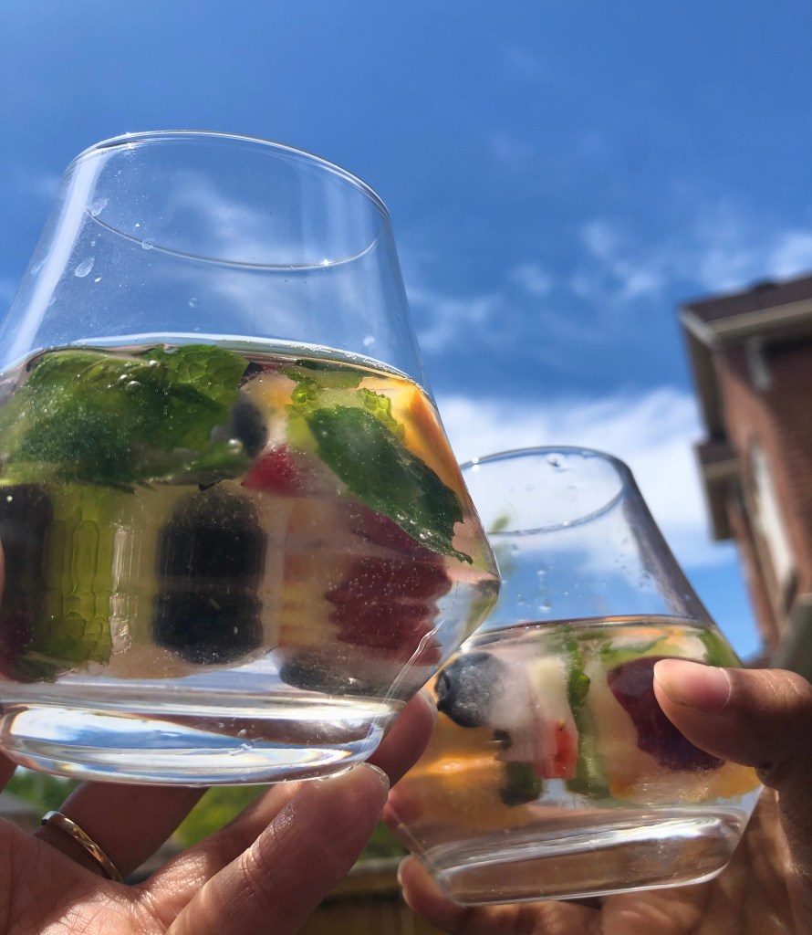 I let it sit in the freezer for about 2-3 hours, then they were ready to serve! They can be served with any summertime drink or cocktail, I love to pair my fruit ice cubes with some la croix or any flavoured sparkling water for added fruity flavour!