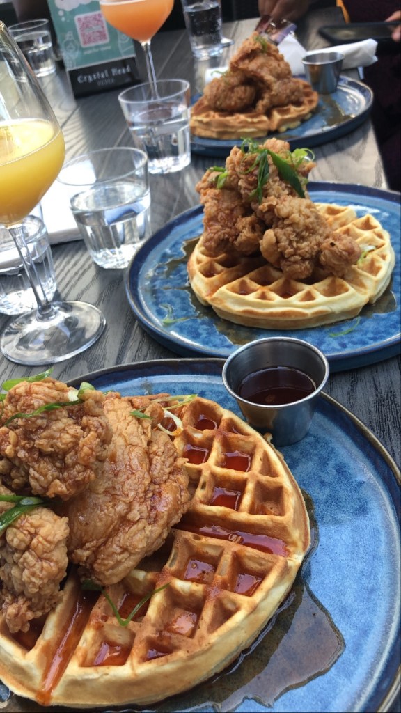 There was so much on the menu to choose from, because it was the weekend they did have a limited menu that was only inclusive of their “fan favourites”, there was a lot of great stuff on their but personally I had my eye on the blueberry brie waffle sandwich, unfortunately it was not on the weekend menu! I decided to go with the ‘still fried’ instead, it was a belgian waffle topped with fried chicken and gochujang (spicy) maple syrup. The food did have a bit of a wait time, so we relaxed, sipped on our drinks and enjoyed the patio. We were having sweet drinks and because of that there were many bees and wasps that were buzzing all around us! This made it a little tougher to enjoy our time here, but it is a norm in Toronto and the surrounding area, you really can’t run from the bees!