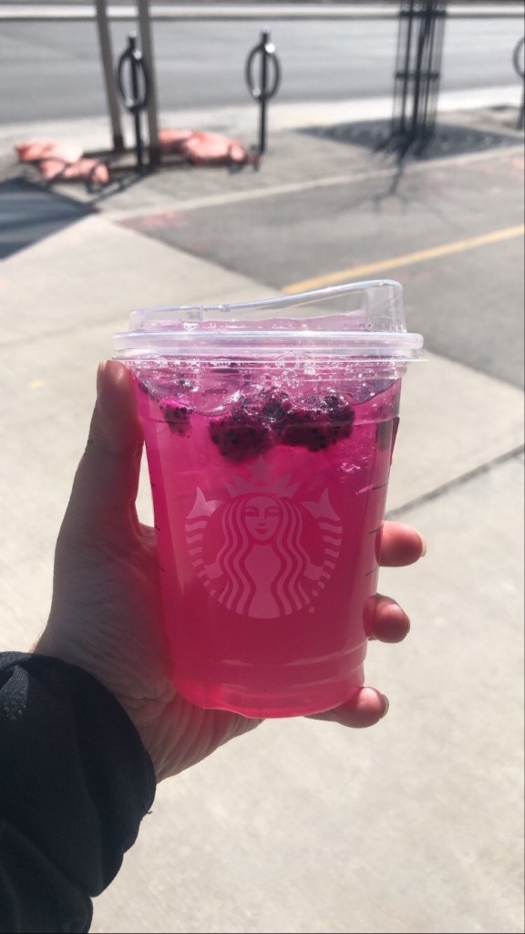 For those Marvel fans out there, this drink perfectly portrays the colours of Wanda! This drink is a little tough to order but is so beautiful if done correctly! This is a mango dragon fruit refresher, with no fruit inclusions (no dragon fruit pieces), and then passion tango tea layered on top! The bottom should be a yellow colour and the top red!