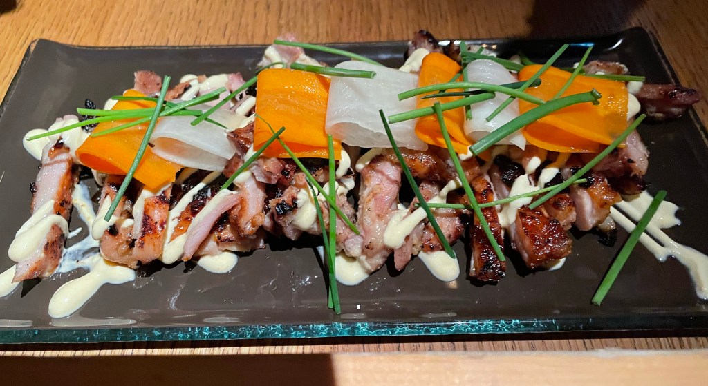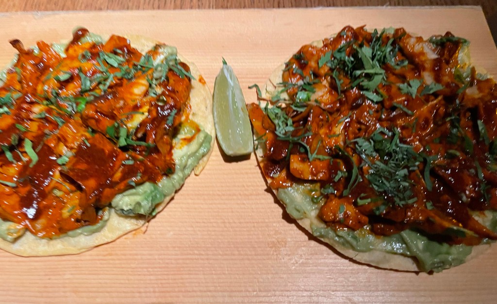 When it came to food, they had so much to choose from, we went with the King Oyster Mushroom Tostadas and Pollo den Miso, the Tostadas came with two servings, they had pulled mushroom, guacamole and a chilli sauce, lime and cilantro on top, it was crunchy and flavourful! The Pollo den Miso is a serving of marinated chicken that is topped with carrots and yellow chilli yogurt! They were both tasty but in my opinion the serving size was very small and the chicken dish did not come with a side that complimented the main entree!