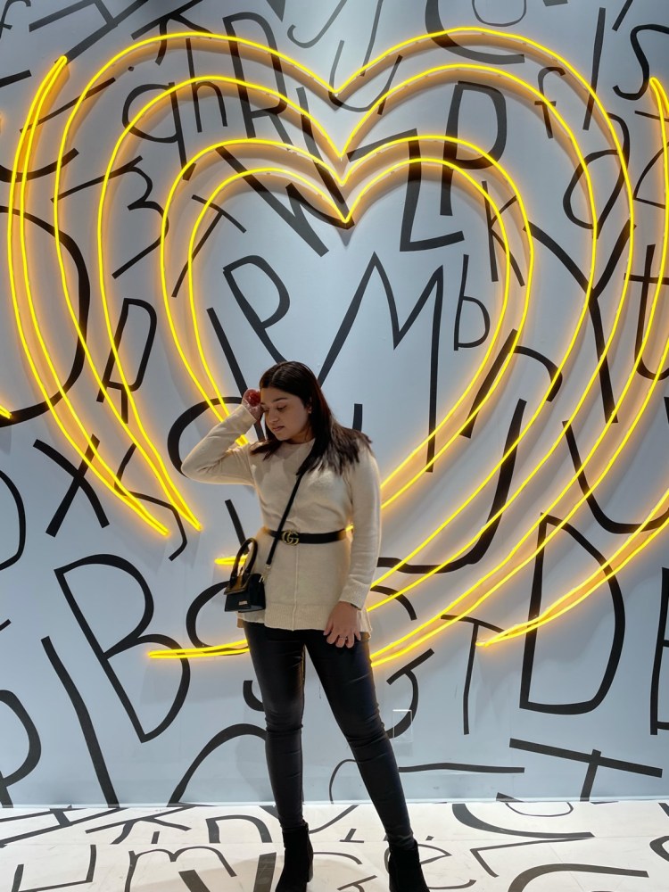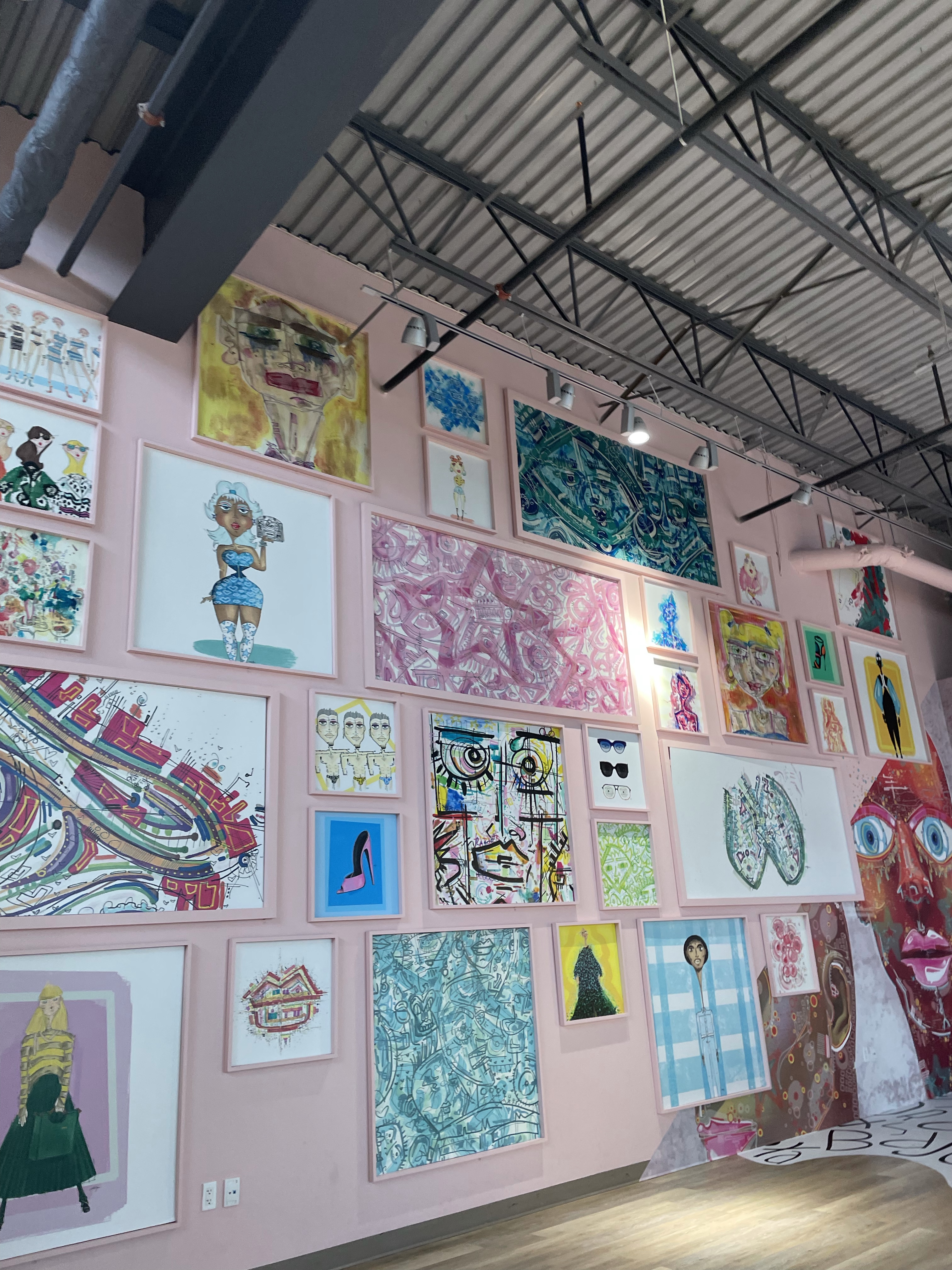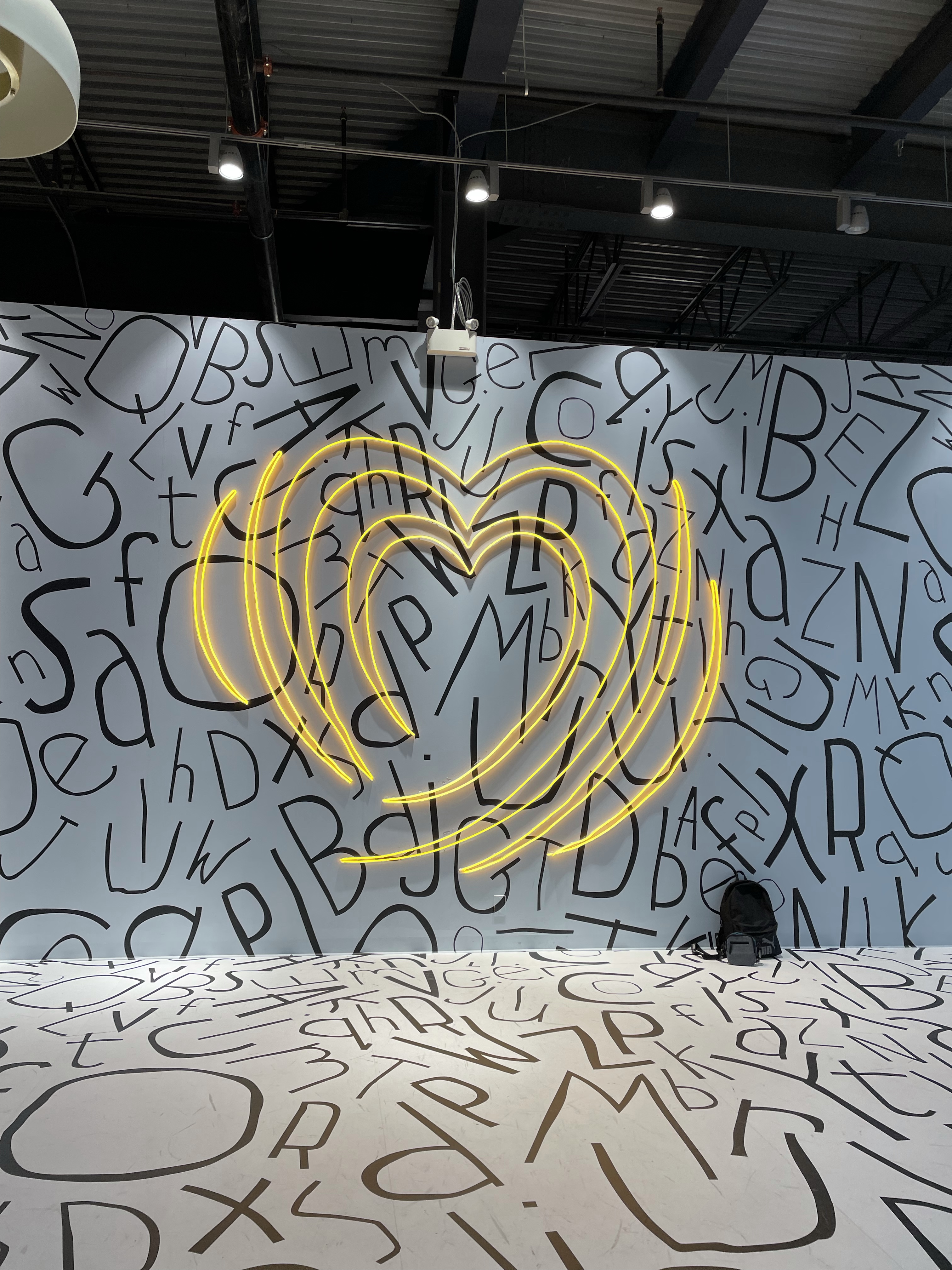 There is a pink wall with vibrant pictures that are separated with different shapes and sizes of picture frames. Another featured wall is a large yellow light up heart that has a black and white background with different lines and curves!