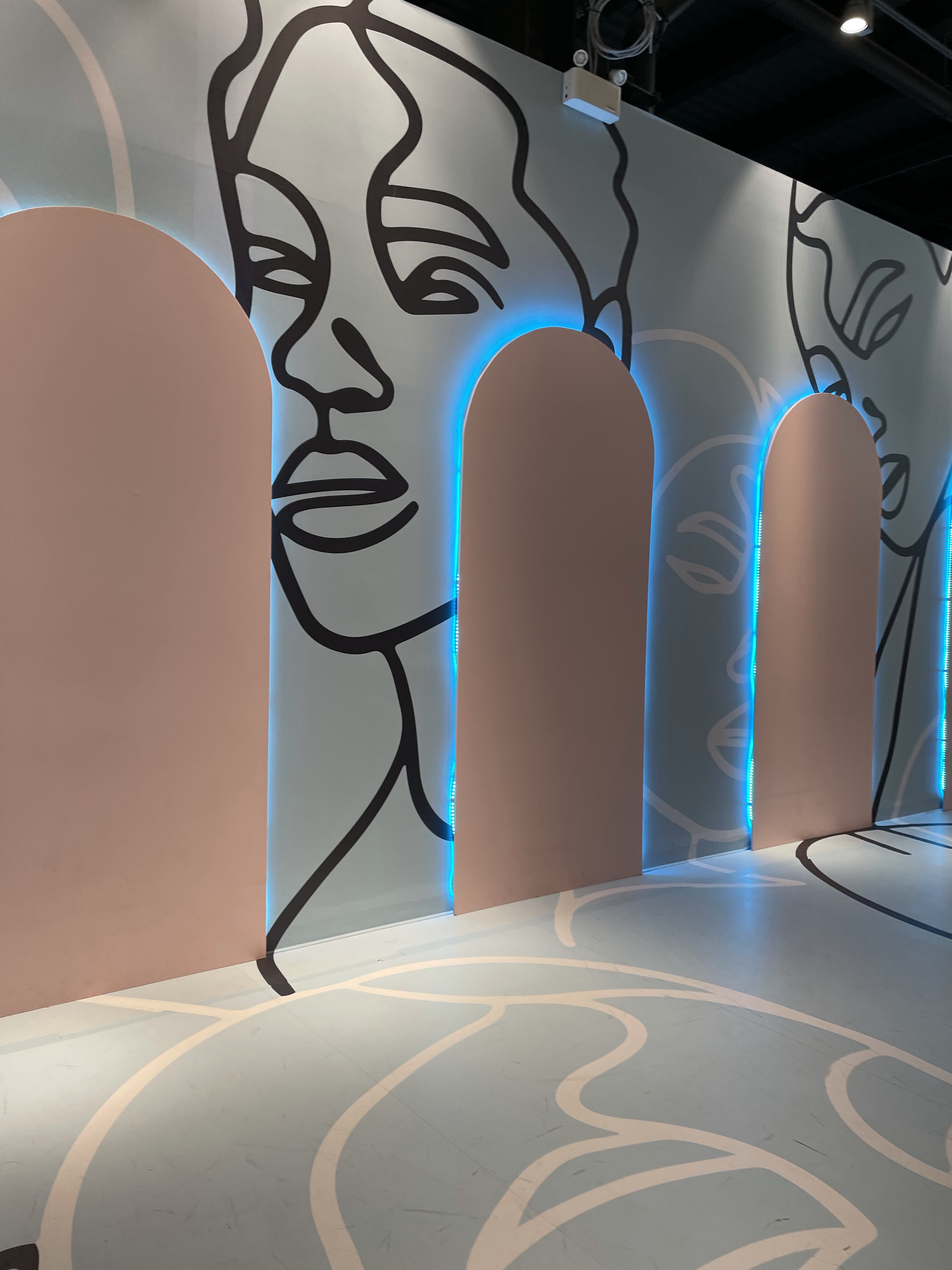 The last featured wall is mostly blue that has layered light pink curved arches that have led lights illuminating the background effortlessly creating the perfect lighting for photos!