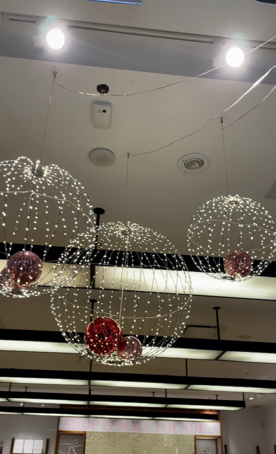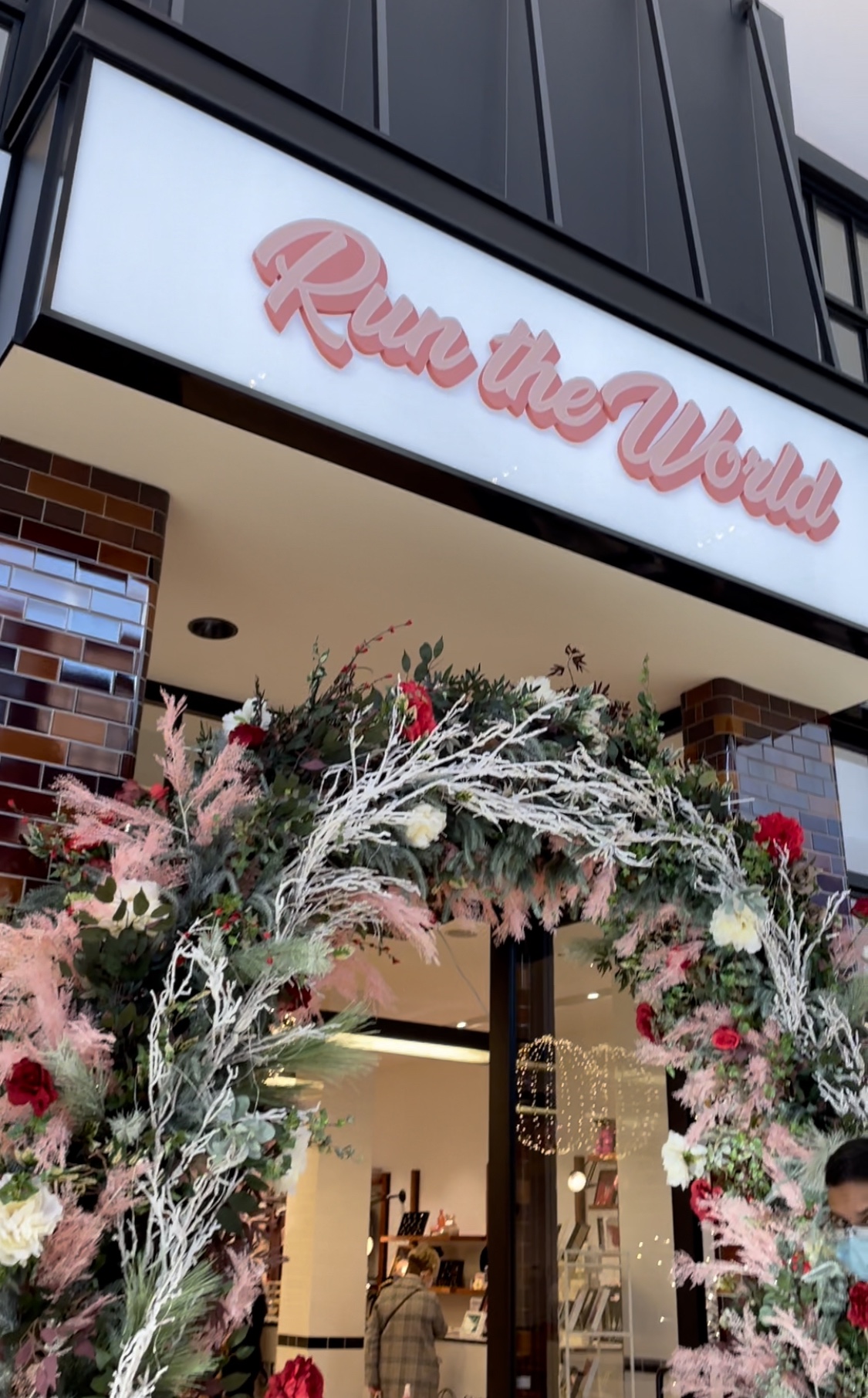 Upon arriving, from the outside there is a huge festive flower arch leading you inside, it is so pretty and has so much holiday feels! Once you enter there see a few holiday lights above you then you are greeted by various businesses! These vendors are changing on different days. When I visited there were booths for loungewear, jewelry, satin pillowcases and other items like hair clips and sleeping eye covers/masks, there was also a booth that made customized photo gifts, this varied from a Spotify plaque to frames roses!