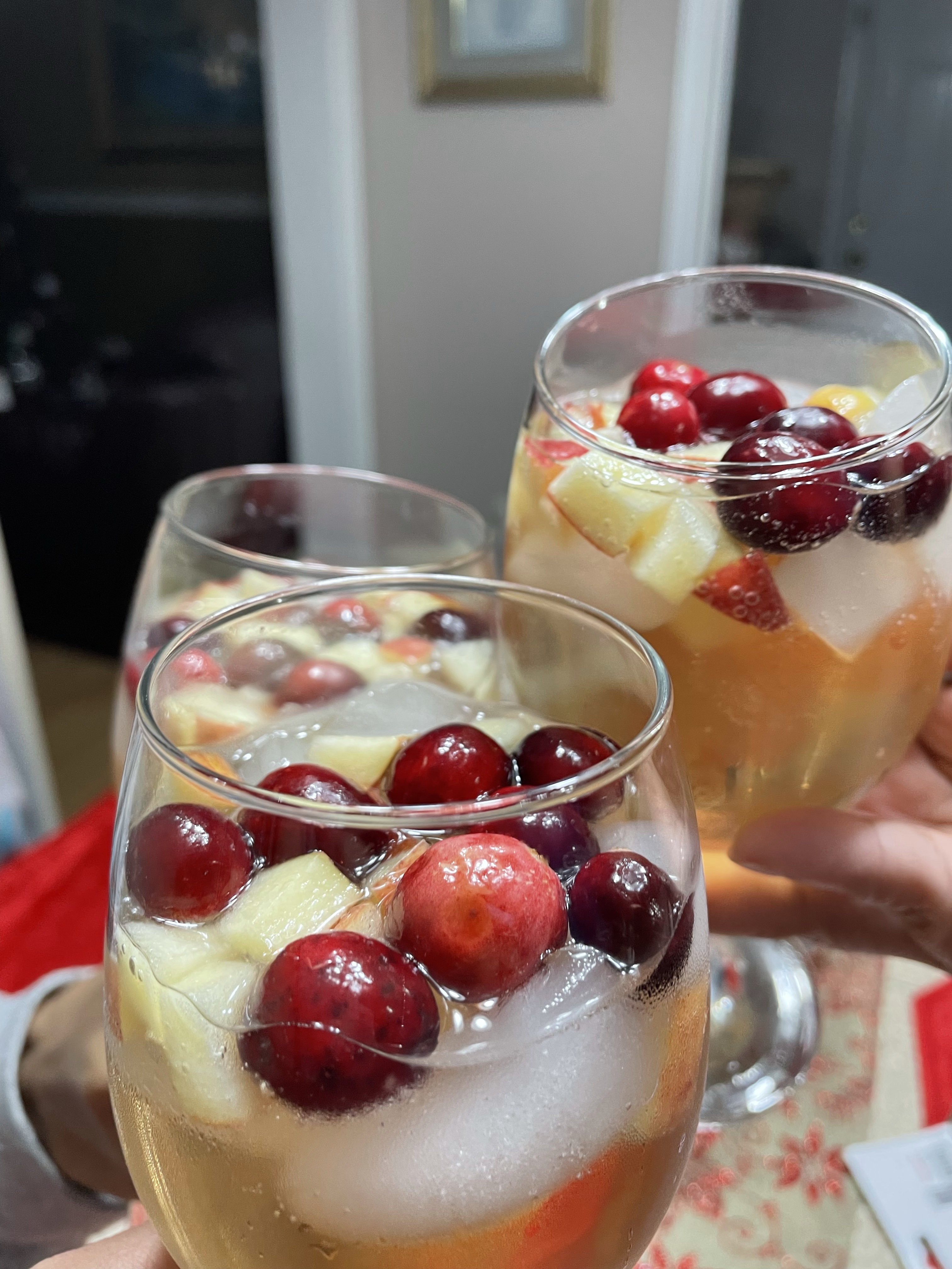 I love sangrias in all shapes and forms and this holiday inspired version of a sangria is amazing! It stays true to the true base ingredients of a typical sangria but the inclusions are festive with cranberries, apples and mint!
