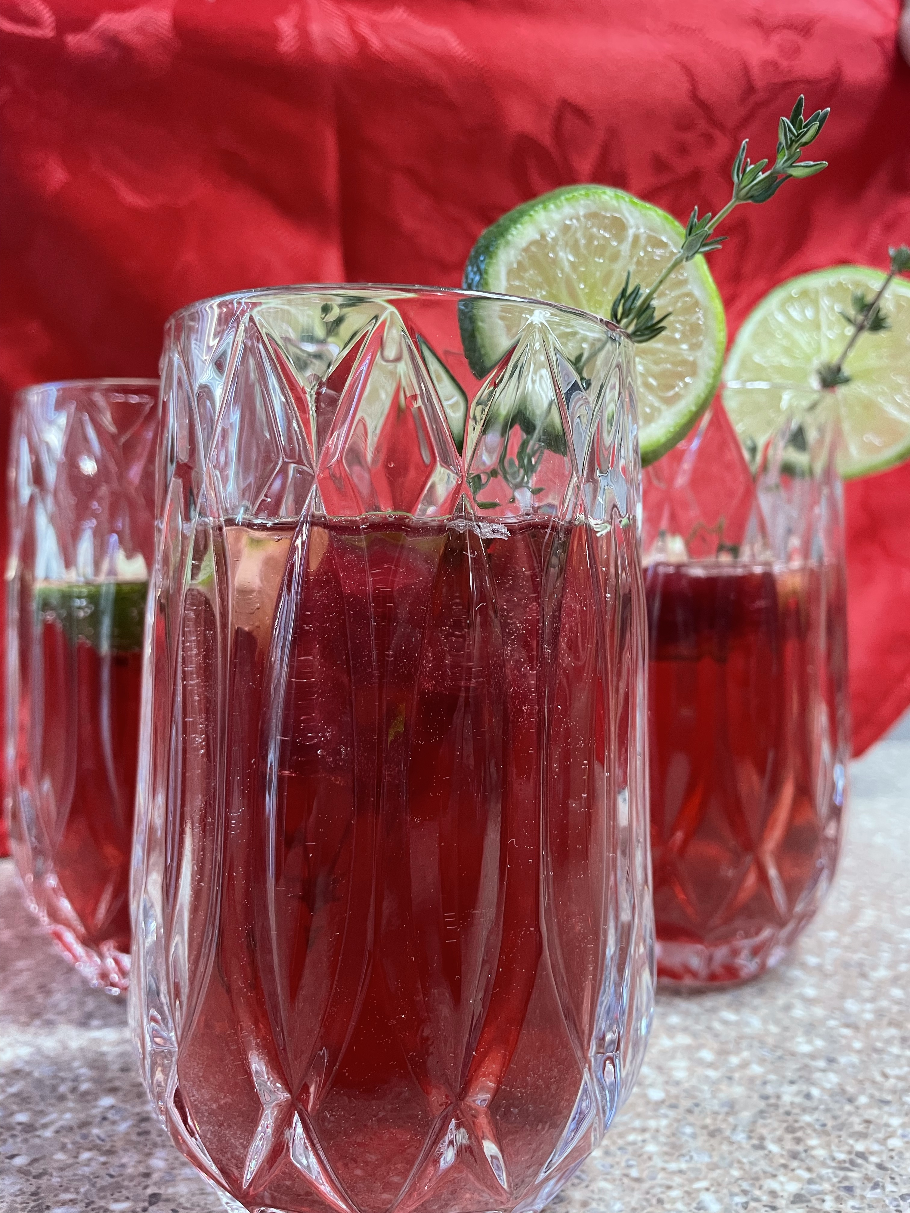 This is my absolute favourite holiday drink! First, dilute pomegranate juice with a little water, then pour into an ice cube tray and freeze for a few hours. Add to glass then pour sparkling wine and ginger ale on top and watch the drink change to a beautiful red colour! Add mint or thyme for garnish!