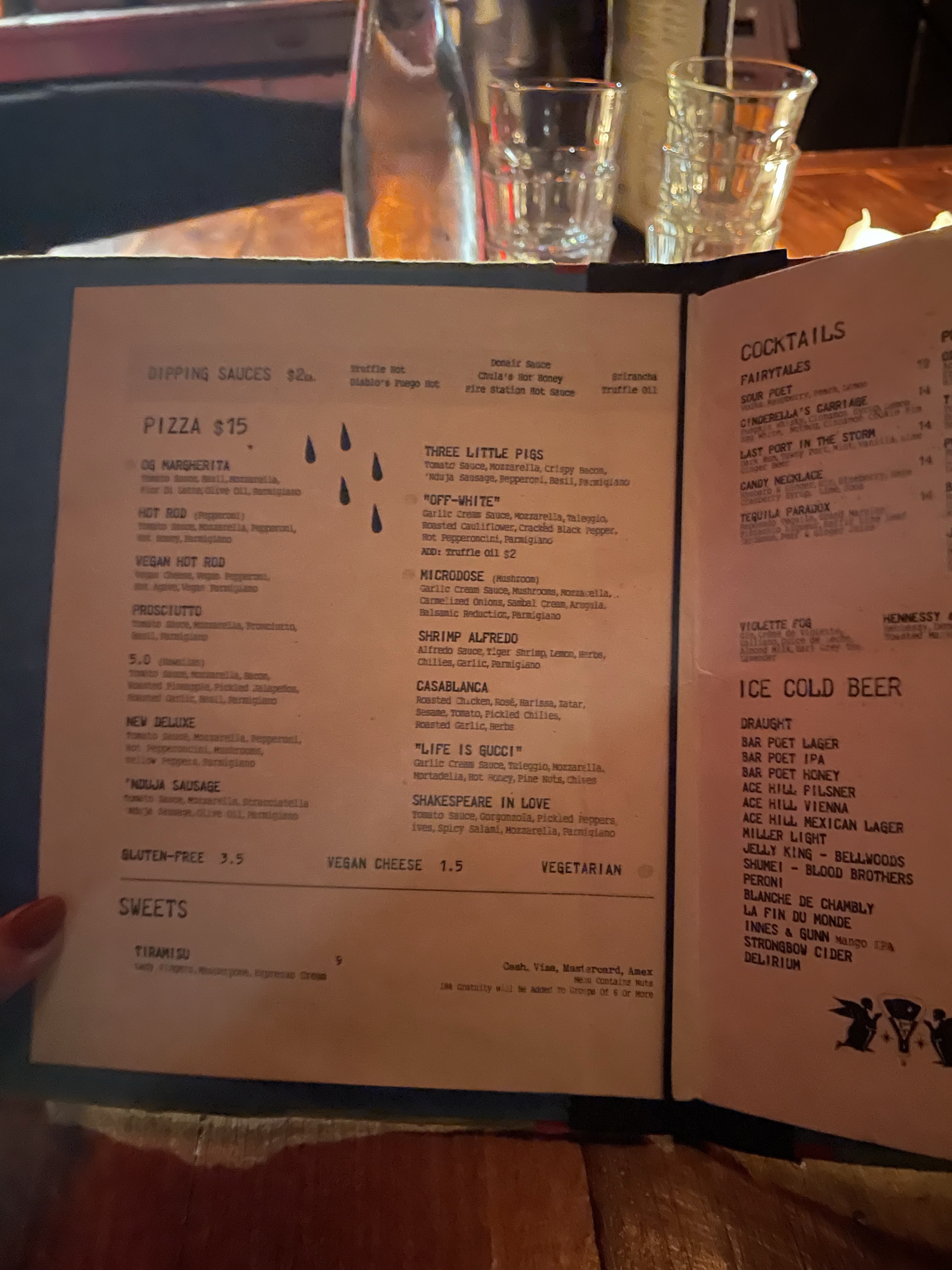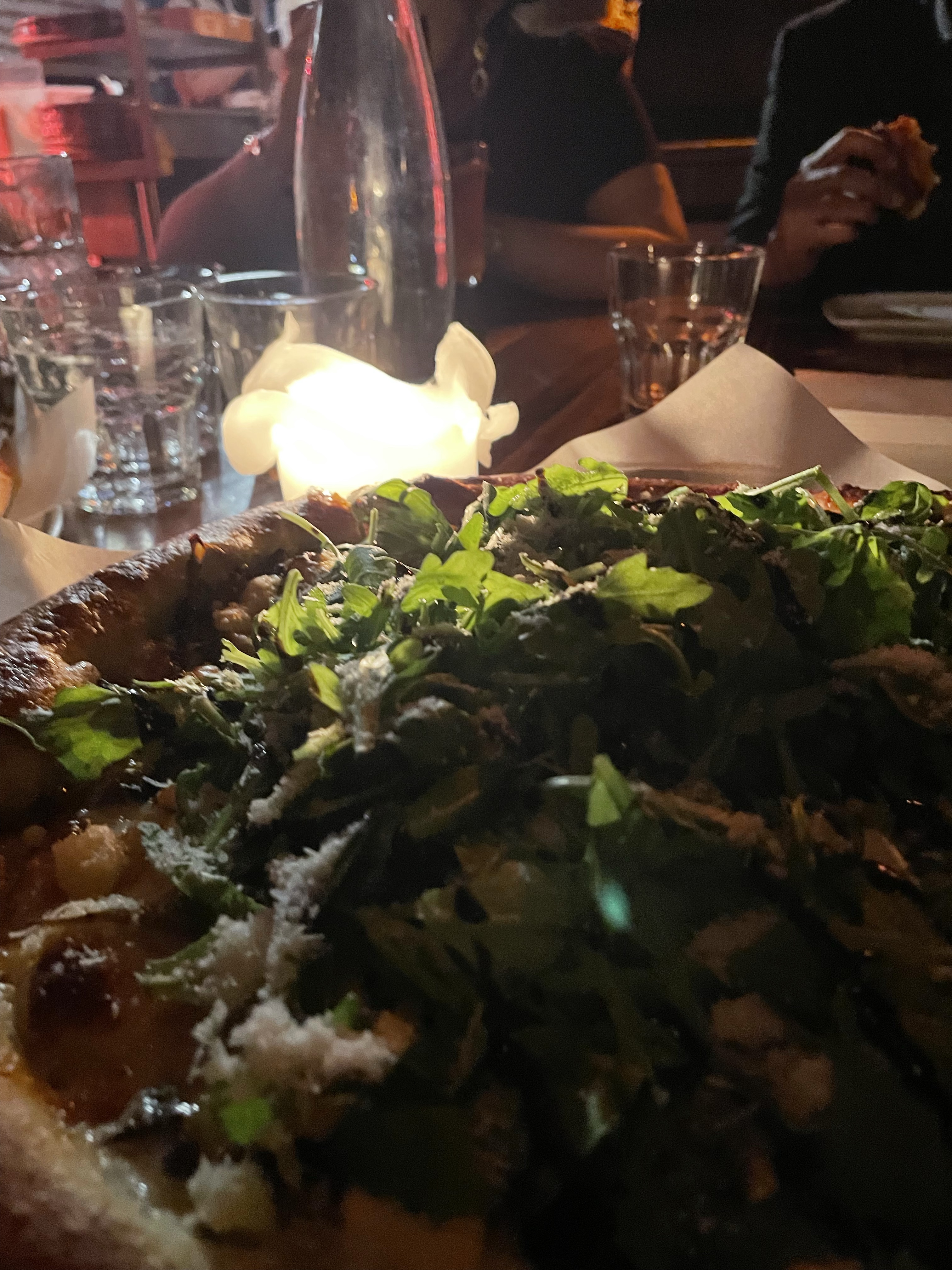 We ordered 3 pizzas and we all shared! Each pizza we ordered had a unique taste! The Microdose pizza was full of flavour, it is vegetarian, has a garlic cream base, with mushrooms, caramelized onions, and topped with arugula, sambal and balsamic reduction! This was by far my favourite pizza! It was so sophisticated, tasteful and perfectly crafted! Next we had the Vegan Hot Rod, it was really delicious! I’m not a huge fan of tomato sauce as the base, which is why this pizza didn’t rank higher, but the hot/spicy agave that the pizza was topped with was so tasty! It was really a game changer! Lastly we got the Casablanca pizza. It has a rose base, I wasn’t a big fan of this as it again had a lingering taste of tomato, but if you like tomato you will love this! This pizza had some delicious pickled chillies that added some well needed spice!