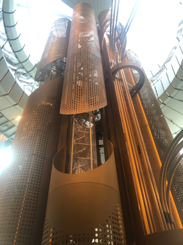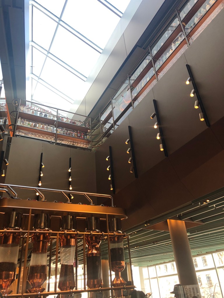 The first floor is really beautiful, it is the first space that you are introduced to when you walk in and it definitely makes you feel like you are in an exclusive Starbucks! It has so many items that are especially catered to the Chicago Starbucks Reserve Roastery! Many souvenirs and take home items, like, cups, mugs, tumblers, etc. as well as grab and go items! I fell in love with a cute little espresso cup that was perfect for my little sister! There is this great card wall that is made with varying coffee cards that spell out CHICAGO! As soon as you start to walk around the first floor you can’t help but look at the elevator that circles around the huge 56-foot cask, as you ride the elevator you can see the coffee beans being moved around in different directions through the different tubes.