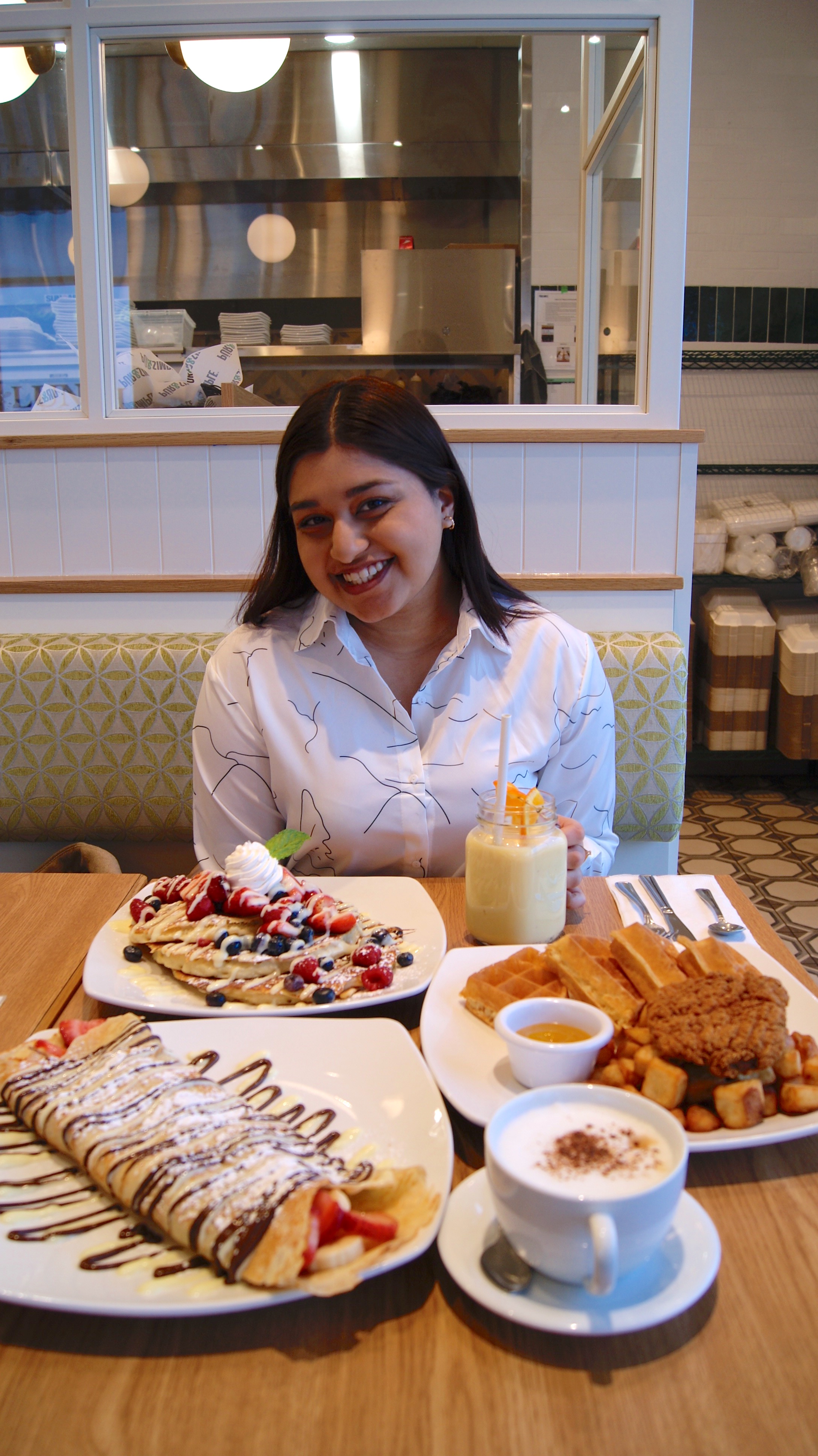 There was so much to choose from on there menu and first decided on drinks! I really needed an energy boost, so I decided to go with the Mango Tango Smoothie! It had mangos, banana, Greek yogurt and pineapple juice, it was the perfect balance of sweet and citrus! It was a perfect thickness and a great way to start my morning! I also had a Vanilla Latte, I absolutely love coffee and this latte was so delicious, it was served topped with chocolate sprinkles or cinnamon! Both of these drinks complimented the food items we got so well!