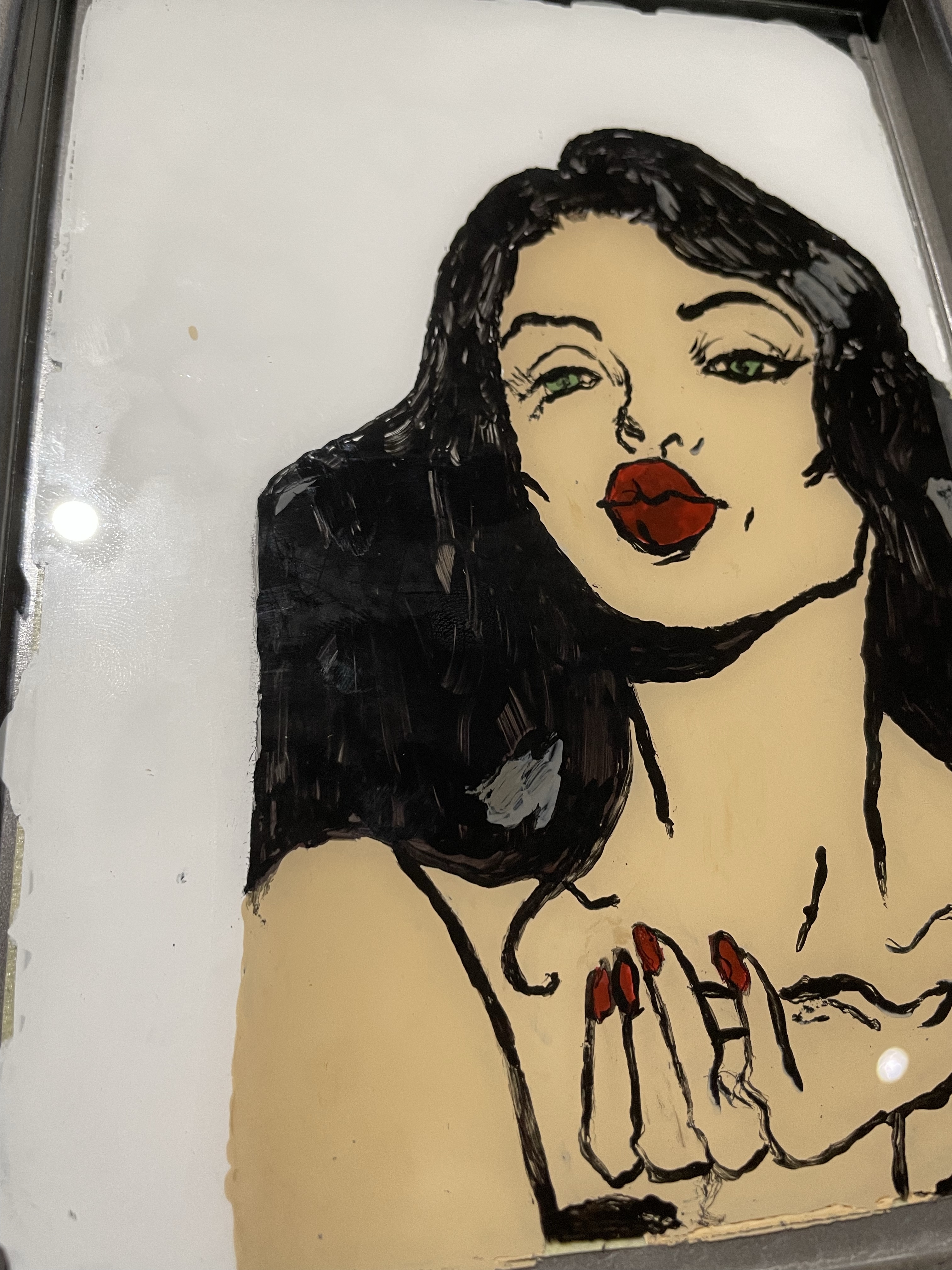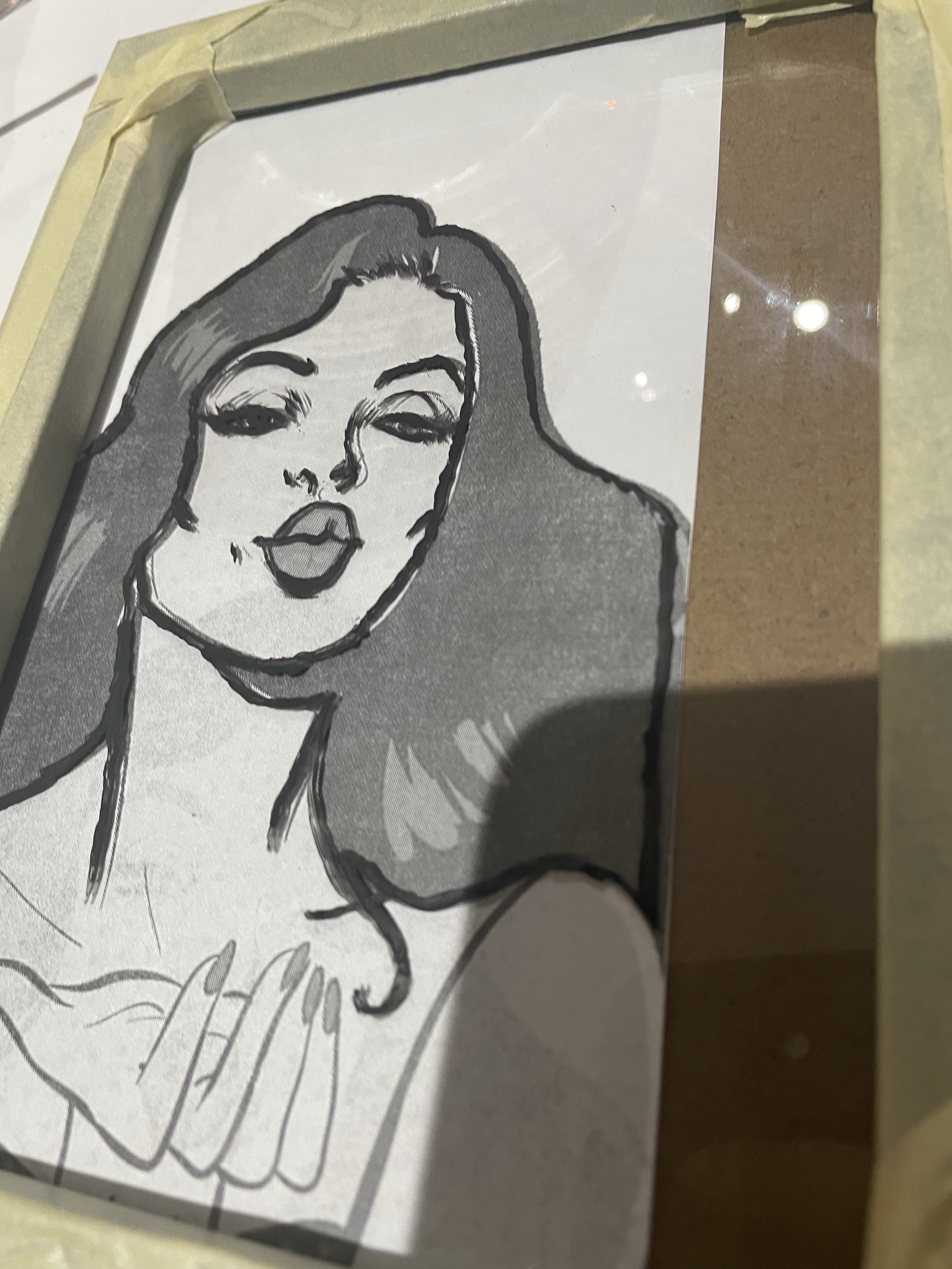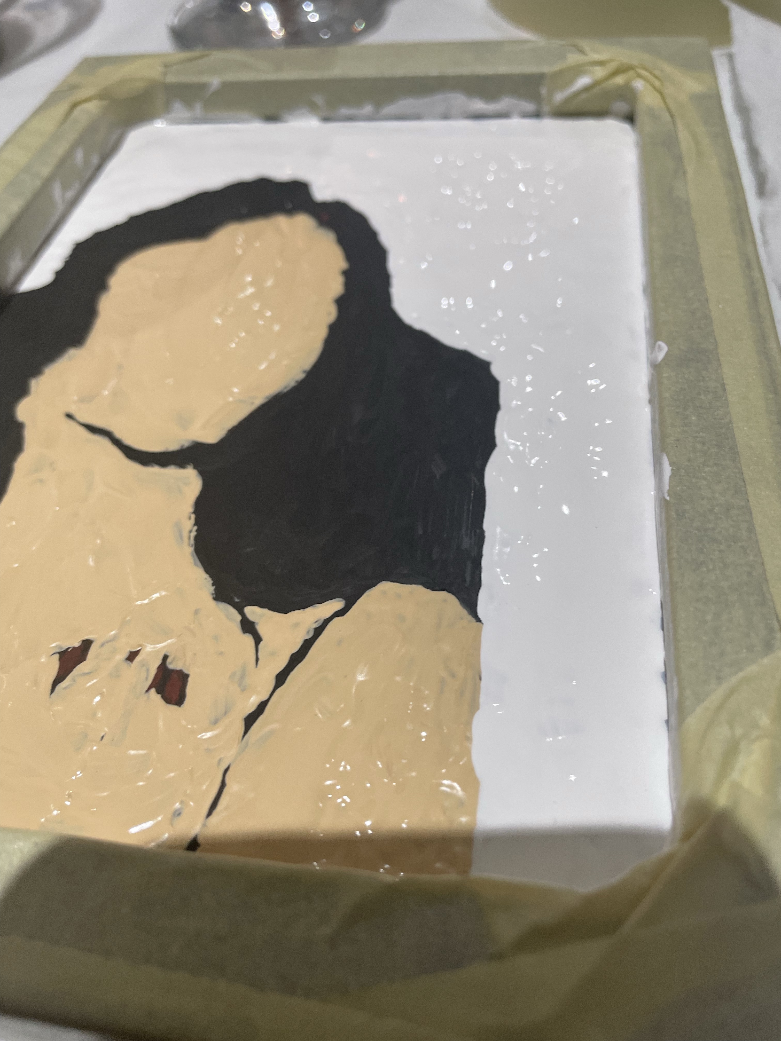 Then you need to start with the outline of the photo, I used black to outline the silhouette and hair as well as the facial features. Once the outline is done, I went in with a thicker coat and coloured in the hair and lip colour, then the skin colour. Once this was completely dry then I painted the entire background white to really make the focus of the picture be the woman and so that the back of the frame wouldn’t show through!