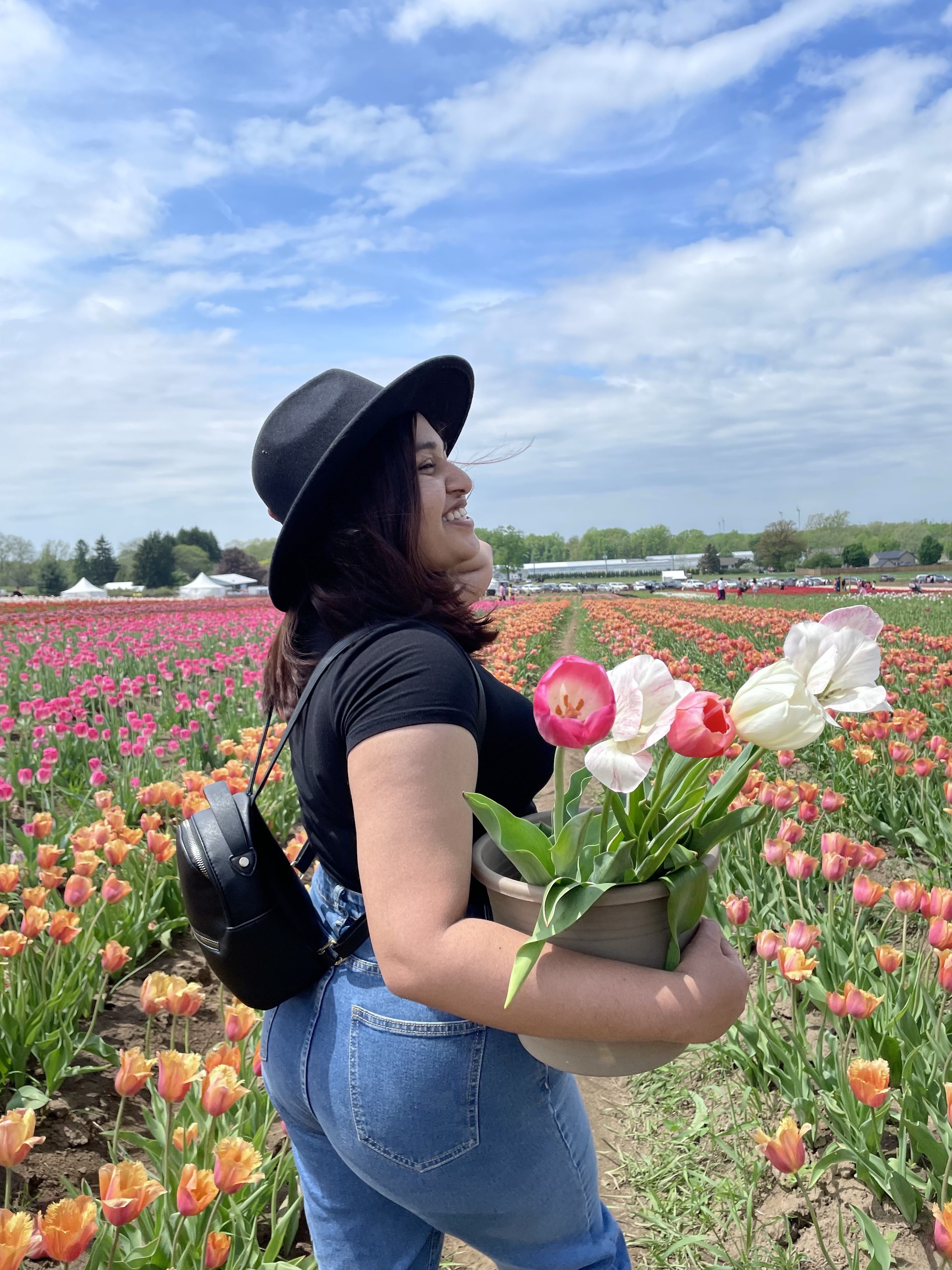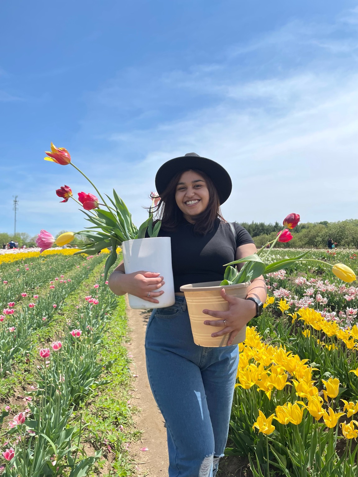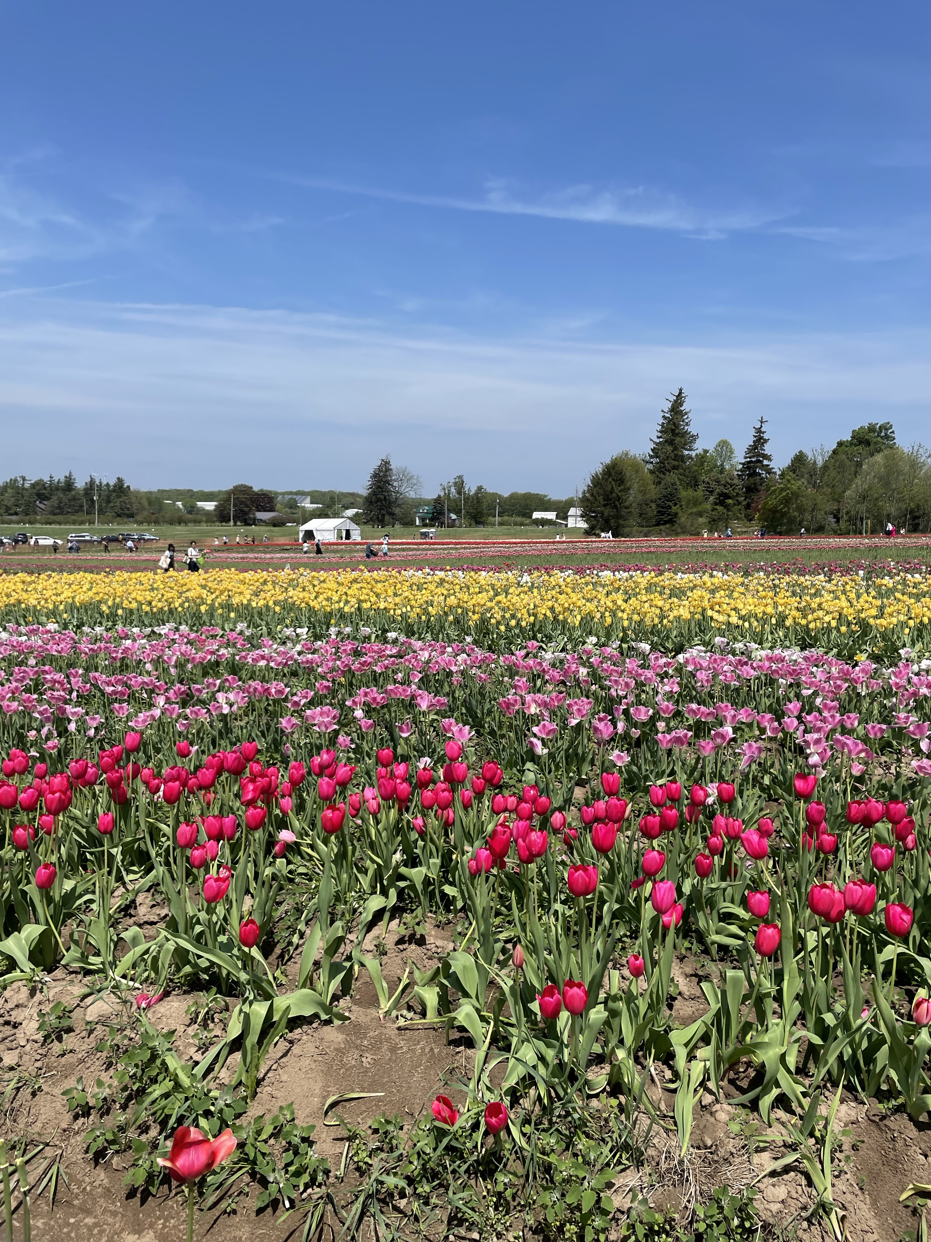 They scanned our online tickets and guided us to an employee that taught us how to properly pick the tulips, the rules of the grounds and where we can get our flowers wrapped after picking! We also got to pick up small buckets to easily gather and pick our tulips while walking through the fields! At first glance, it is absolutely stunning, there is a sea of tulips organized by colour and all in full bloom!