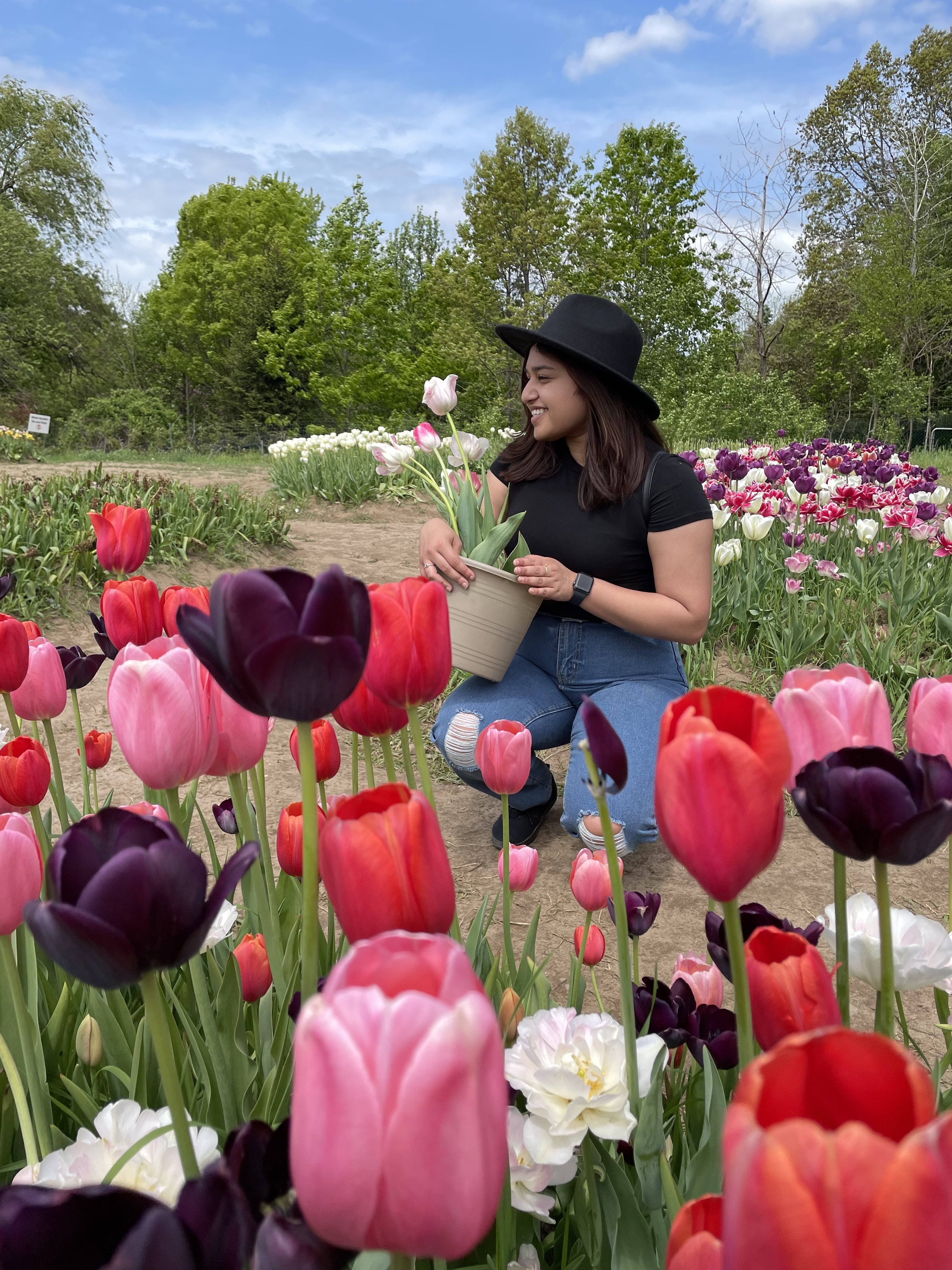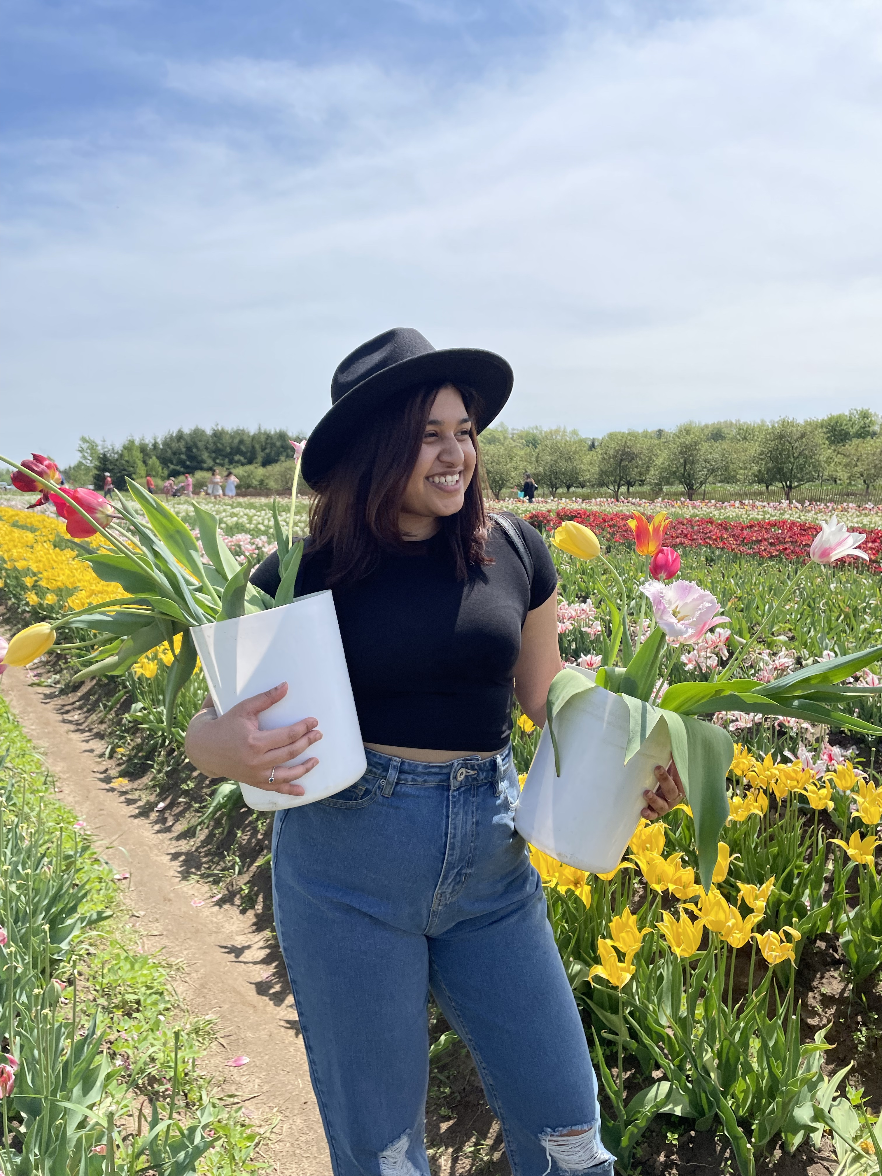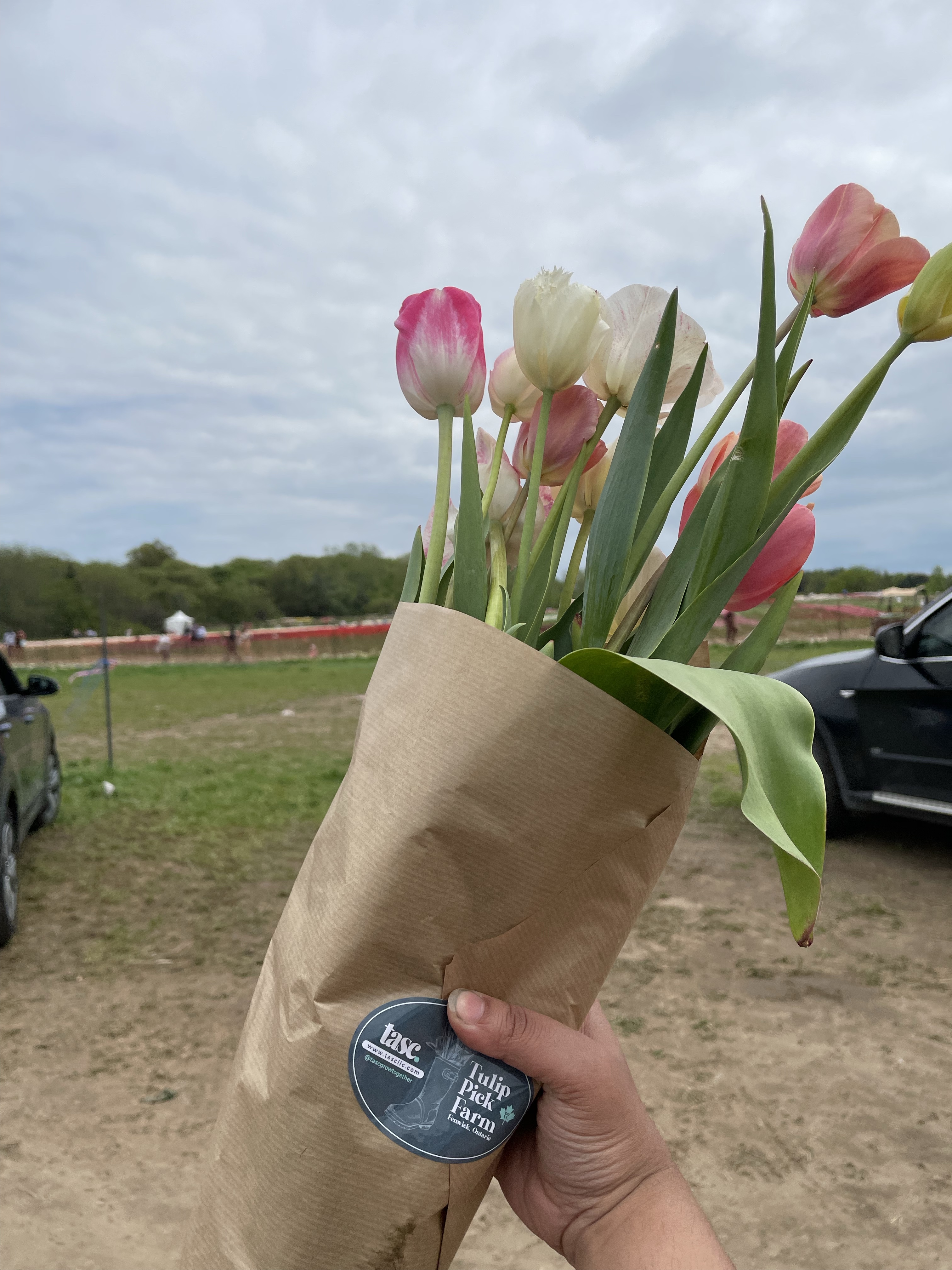 We started with the first few rows and picked the flowers that caught our eye, each creating a theme and colour palette for our bouquets! There were so many different colours, types, shades, and hybrids to choose from! We learned how to correctly pick the tulips which were holding close to the root, twisting and pulling up! This made it significantly easier when picking!