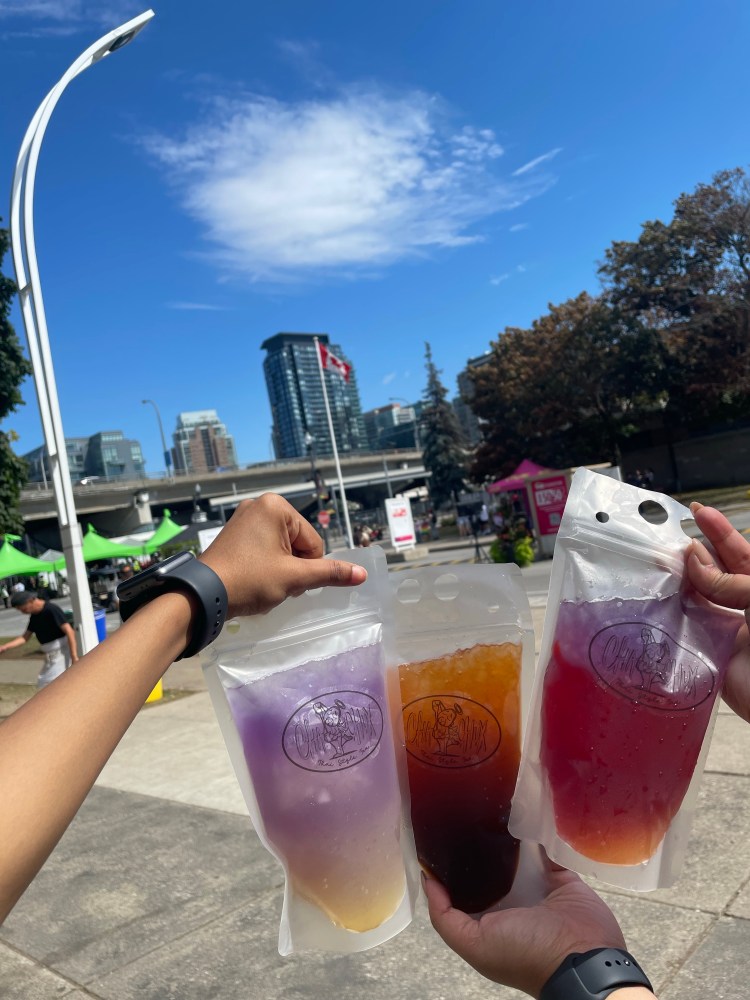 We exited the arts and hobbies building and walked around the outside areas and checked out some of the games and other vendors. We were still a little hungry and decided it was time to check out the food building! There was an overwhelming amount of awesome food and drinks to indulge in! We started with drinks and found these drinks that looked so bright and beautiful and they were packaged in bags/pouches that made it really easy to carry around! We got a Butterfly Explosion that had butterfly pea tea with lemon, sprite and mint, we also got a Giggly LGBTP this drink had lychee, gatorade, butterfly pea, tonic, pineapple and JELLO! It was so yummy and refreshing, lastly we got a Thai Lemon Ice Tea. This is a twist on Thai Iced Tea because it includes lemon! They were perfect for the hot day and for the gram!