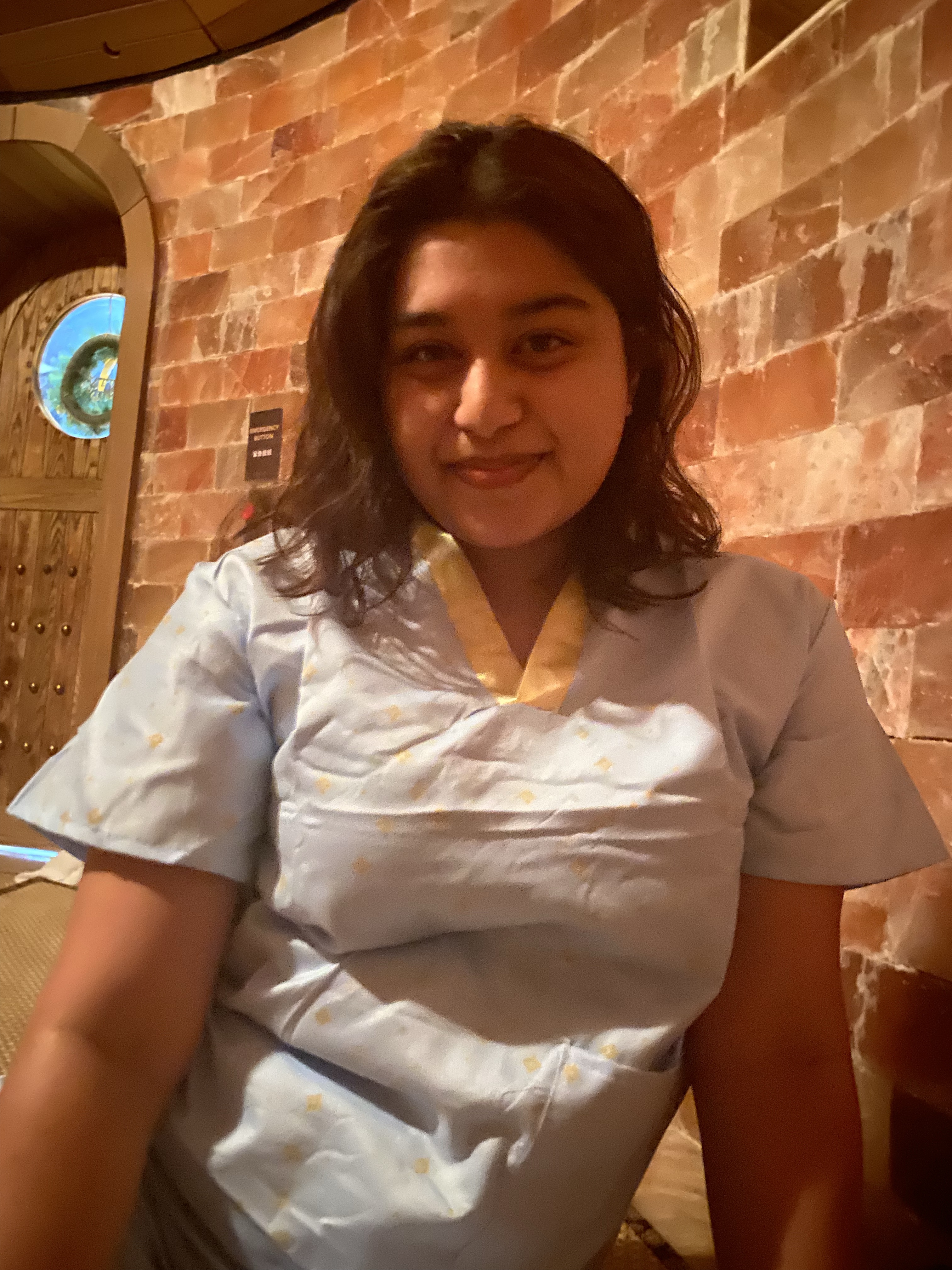 Then we headed into the changerooms. There was a desk in the changerooms that helped us locate where our lockers were based on the number on our wristbands and gave us cotton outfits to wear. The lockers were on both sides and the hot tubs were towards the back left corner, the hot tubs were also connected to the showers and bathrooms. We changed into our swimsuits and headed to the pool area. There were many large pools, two tubs were larger with the temperature shown, one was really warm and the other was comfortable. There was a long pool with pods and other jets! This was my favorite because it didn’t feel crowded at all, there was a pod for everyone and there was more than enough space!