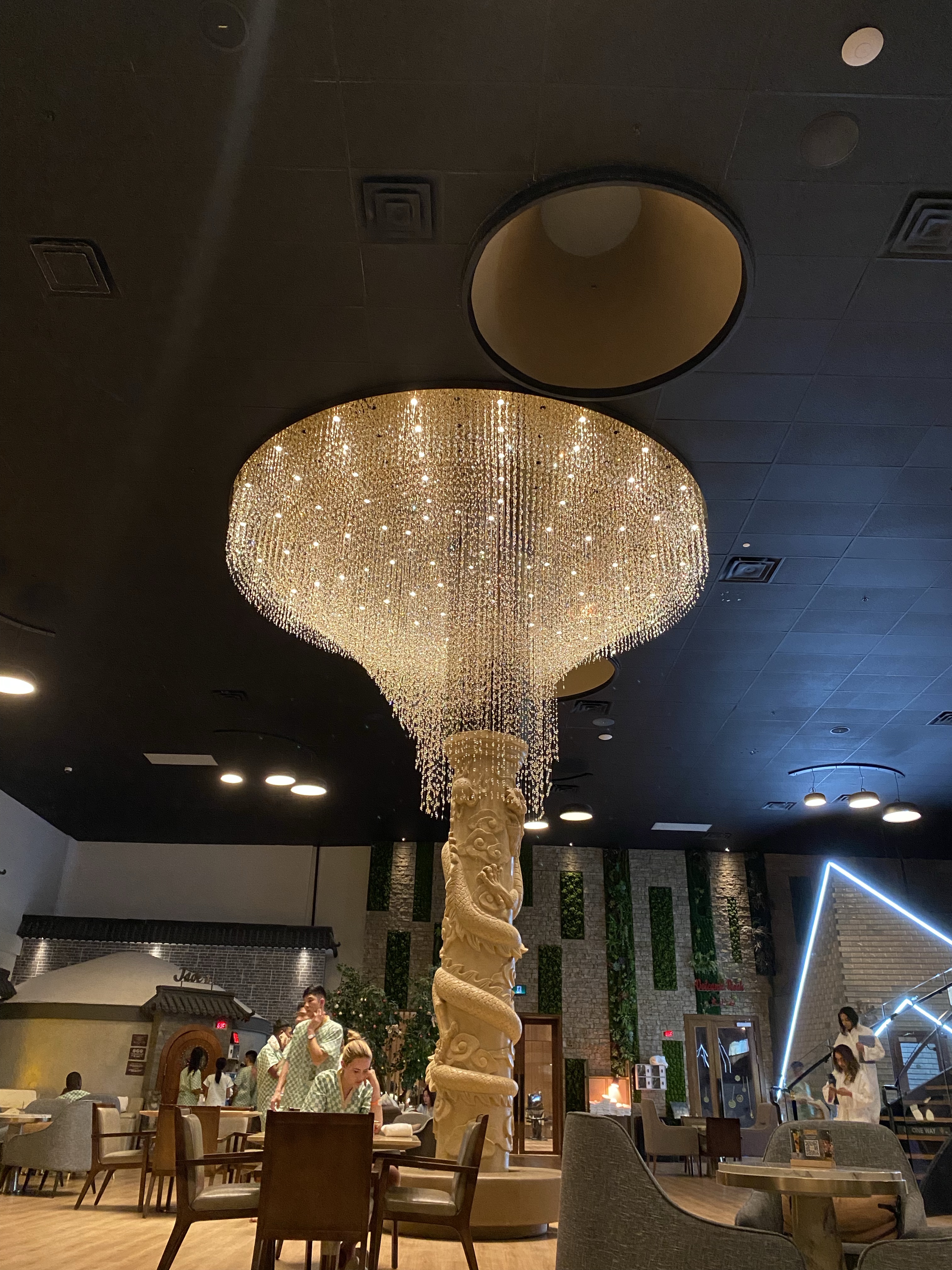 Once we got ready we headed into the main sauna and communal area, this is where we met up with the boys in our group! This space is beautiful, first you are led through a hallway of books and chairs, which is a great spot if you’d like to sit back, relax and take some time to read. The main chandelier is stunning and the first thing your eyes are drawn to when you enter the central space. The first thing we did was hydrate at one of the water stations and decided which sauna we wanted to go to first. We settled on the Jade sauna room. This room is lined with real jade minerals and is kept at an optimal high temperature to boost immunity, help get rid of headaches and protect skin! This was once one of my personal favorites, I really liked the temperature of this room. It was warm and the jade on the walls not only felt great on your back but really did help the overall relaxation of the sauna!