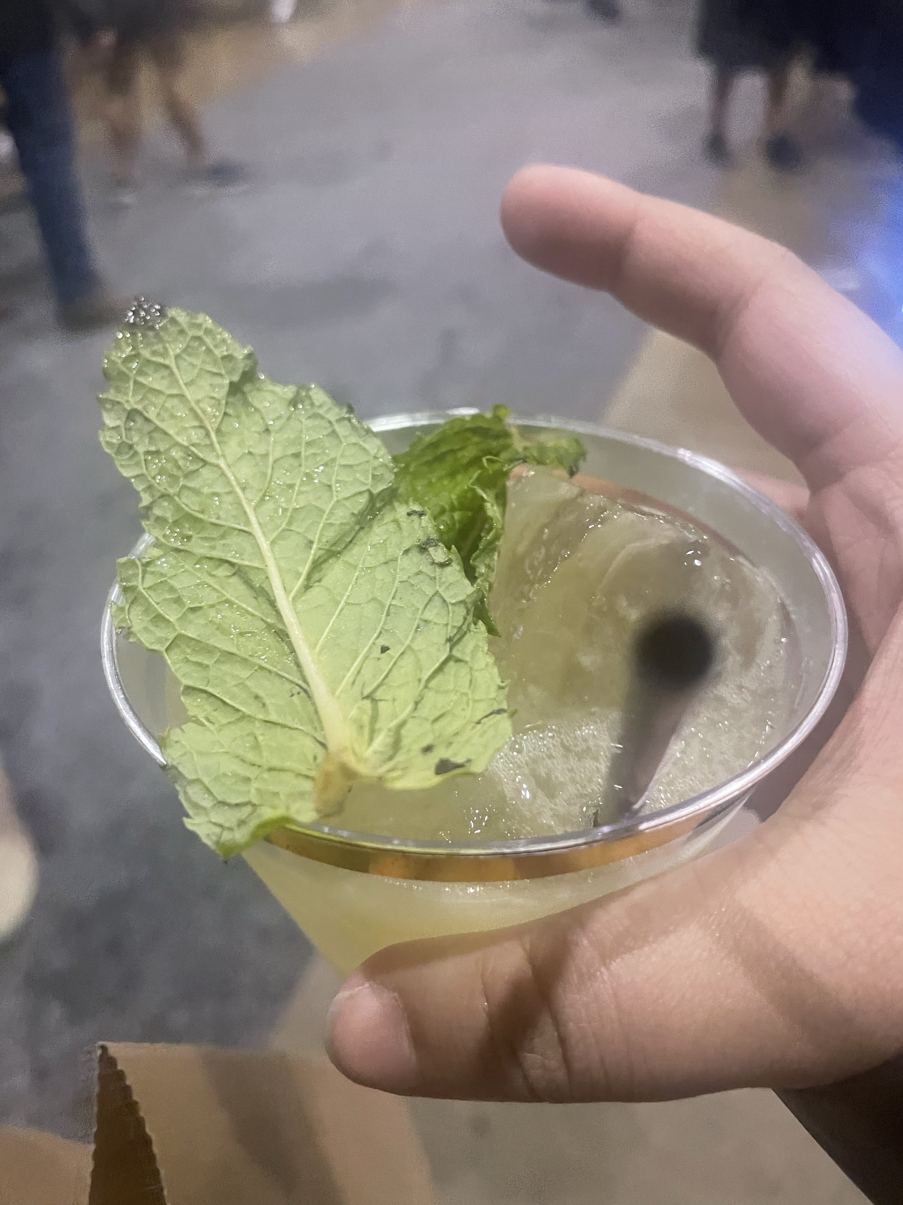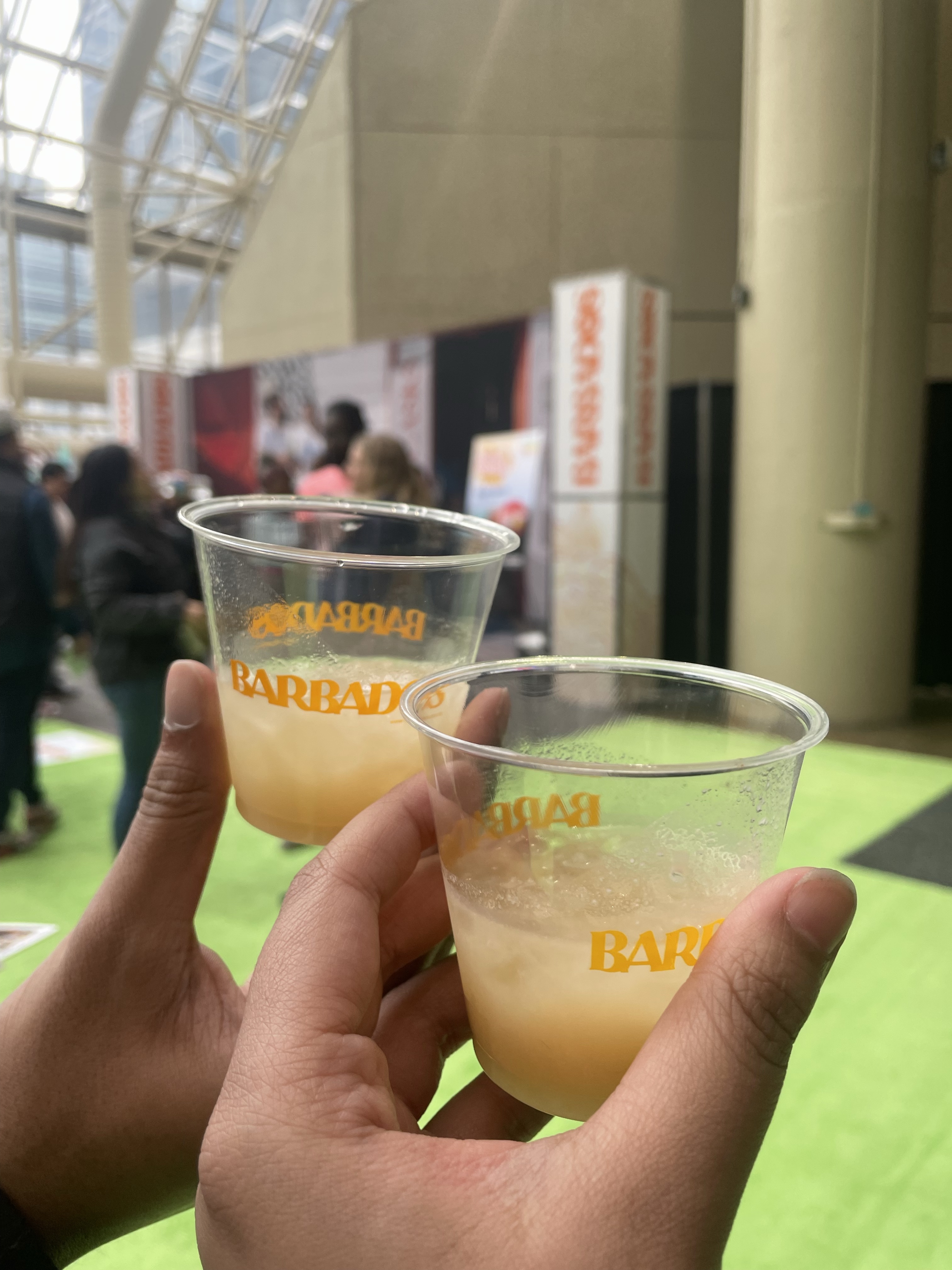 The first booth that you see is the Barbados booth, this has fun vibes, great music, people in costumes and most importantly, really good food and drinks! They gave us a drink with Bajan rum, banana liqueur, and honey syrup, and it was paired with a banana chip dipped in chocolate. They explained to us that the way they curated the combination to taste is by combining the taste of the chip and drink, having it all at the same time! And it was absolutely delicious and really had some amazing flavor!