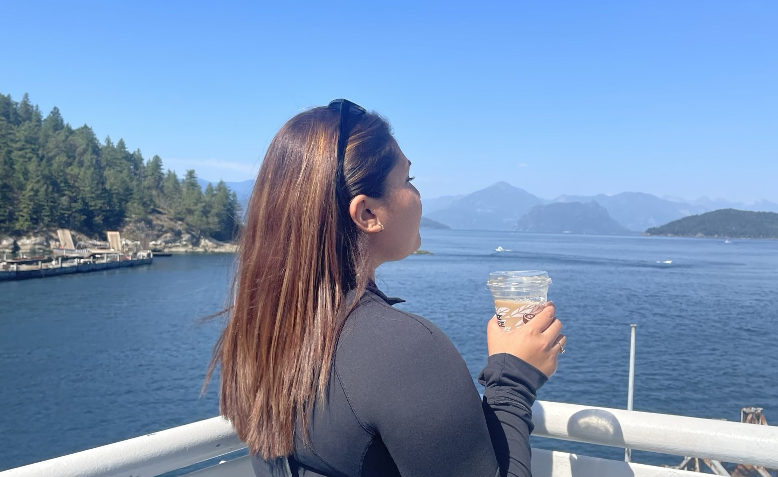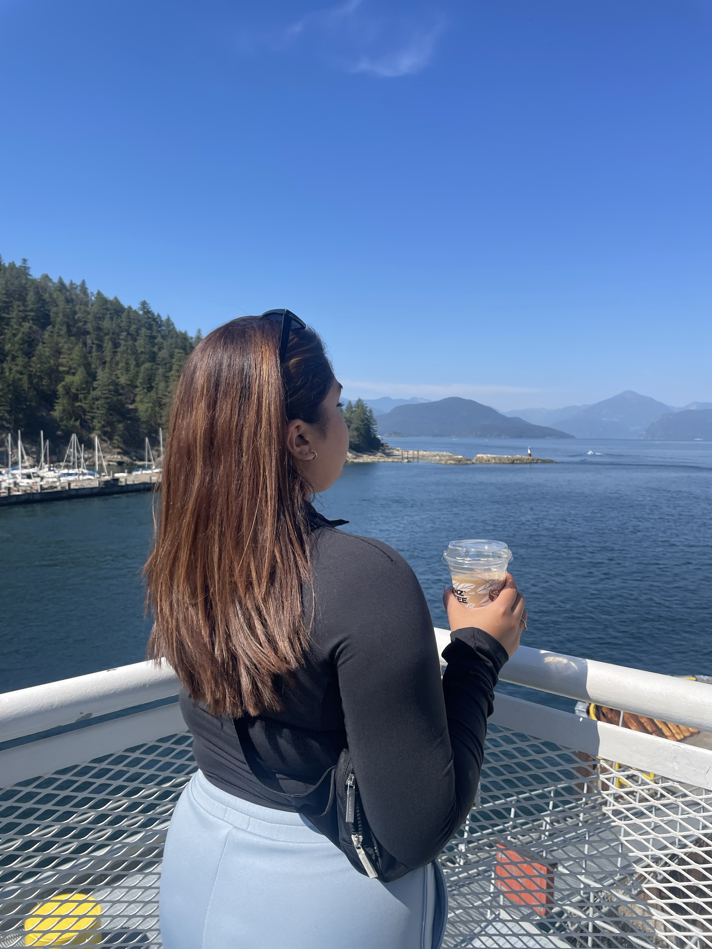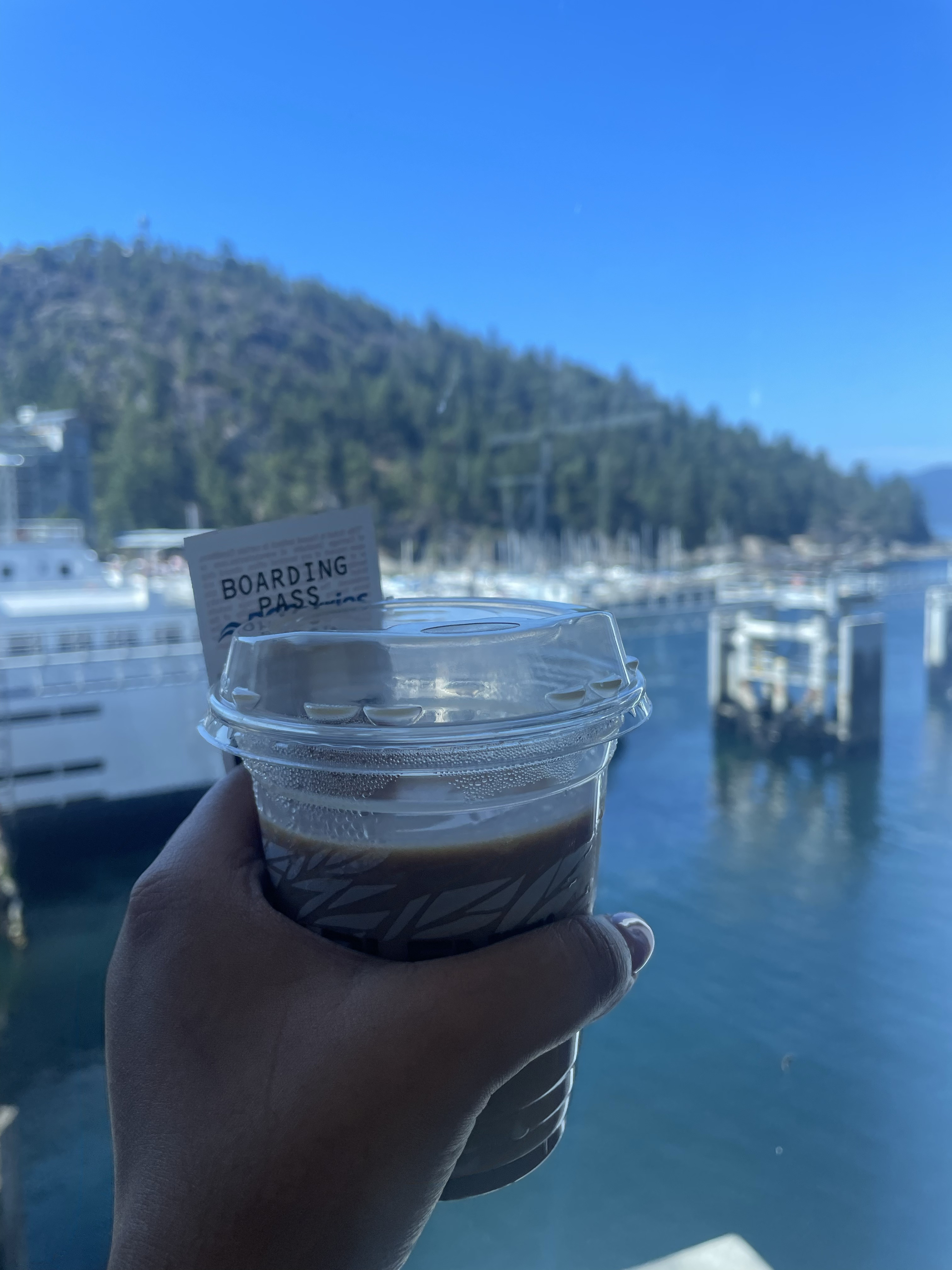 Because we had some time to kill and were admittedly quite hungry we decided to check out the area adjoining the dock called The Village! There are so many small shops, independent restaurants, fast food, coffee shops and more! We opted to try out a restaurant called Olive and Anchor – full blog on our experience here coming soon! Once we were done eating we walked around a little and took in the scenery near the boardwalk! Once our boarding time was getting closer, we decided to grab some coffee from Blenz Coffee. I got an iced chai tea latte with an added shot of espresso and it was really great!