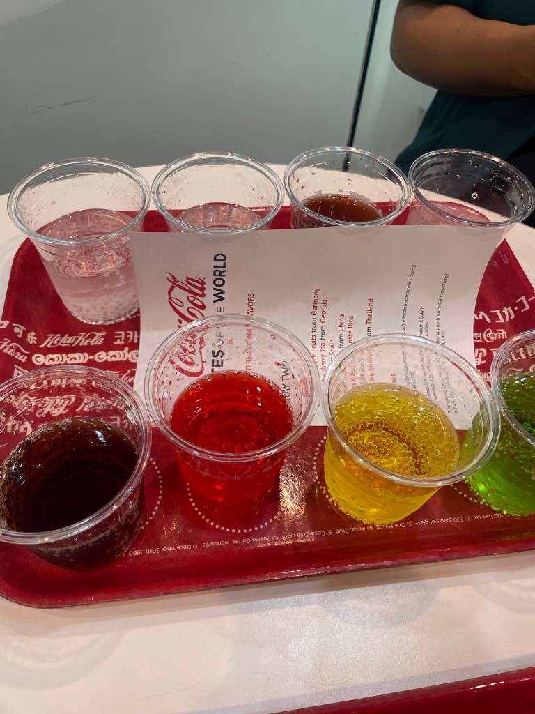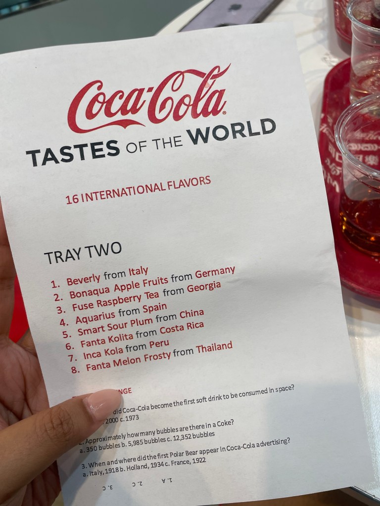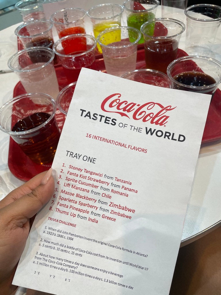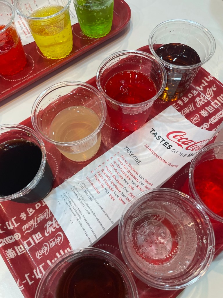 On the second floor, this unique adventure invites you to take your taste buds on a global journey, the international tasting flight. The Coca-Cola tasting experience offers a sampler of 16 different Coca-Cola products from around the world. Each drink provides a glimpse into the diverse flavors and cultural preferences that are incorporated in preferred beverages and sodas globally. Here are some of my personal hits and misses: